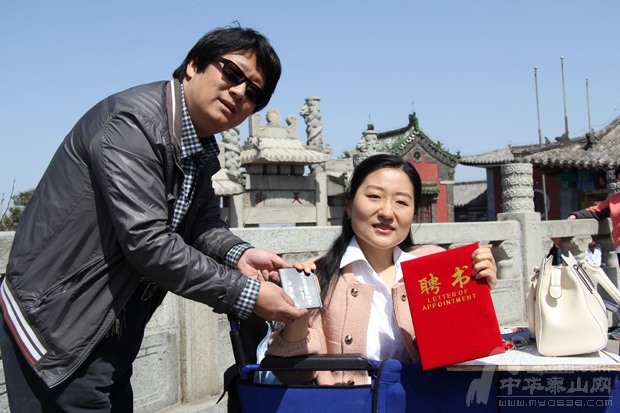 2013年4月14日,参加完泰山网络文化传播奖的最美轮椅姐姐刘晓清,在泰山之巅天街观景台接受了我会的聘书。